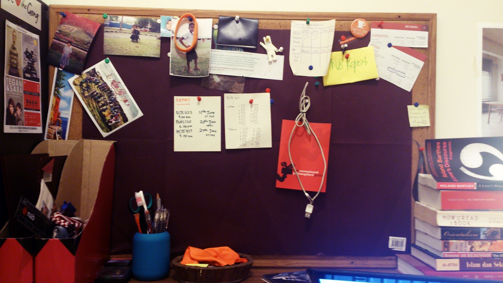 There is a certain comfort in cleaning up your own room. To begin with, I have removed most of the things from the corked board, leaving nothing but the exam schedule, and photos, photos of my child, the siblings as children, of friends you no longer see actively in your life. A pen drive, marking your position as a student, a toothbrush to signify that occasionally you shall sleep from one house to another, a lens cloth to say that you wear classes. Then there are those books. What do they mean, if Al-Attas was lined with Kafka, , Said, Beauvoir, Barthes and Rilke? It means you are in a state of confusion. A crisis of identity.